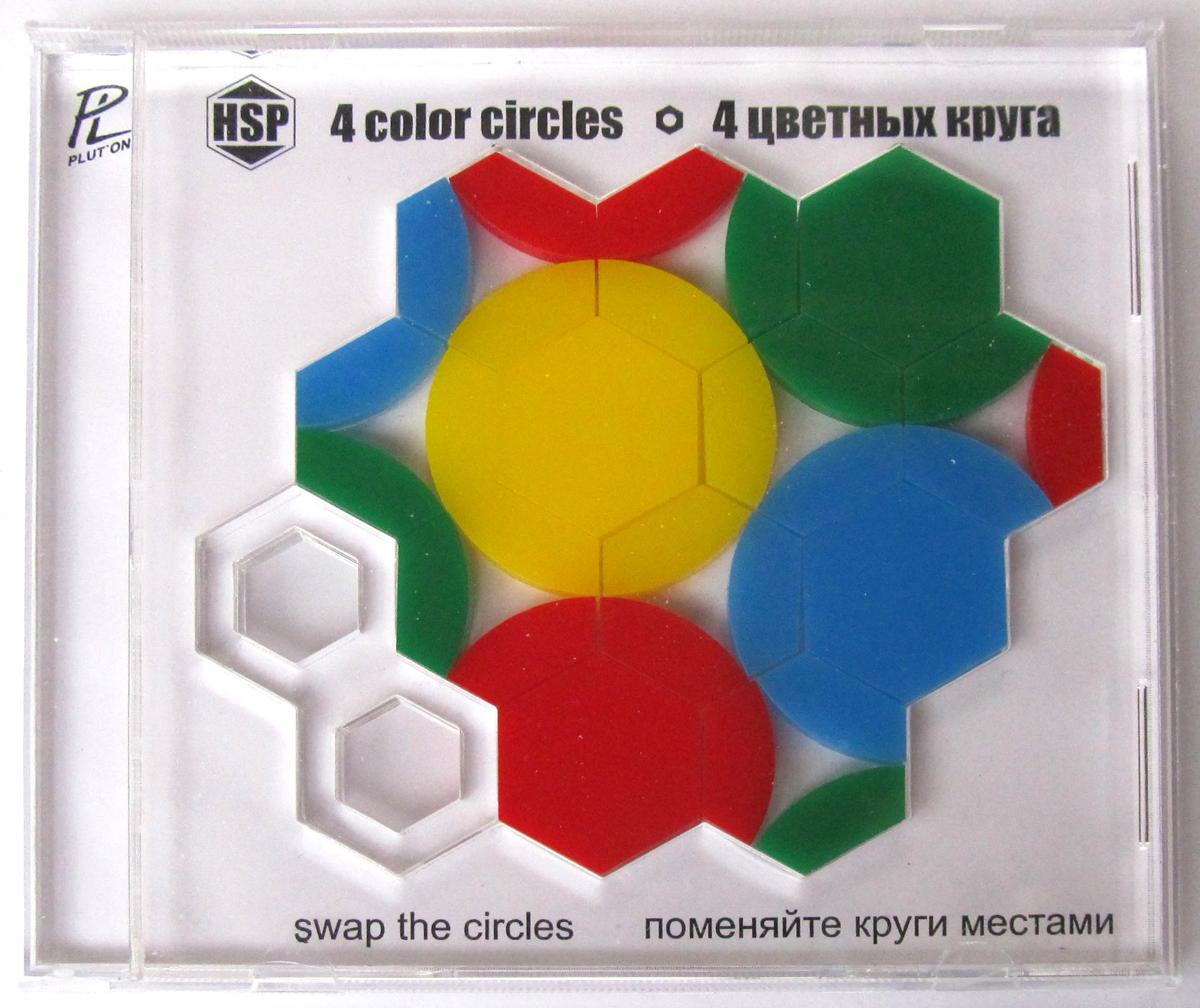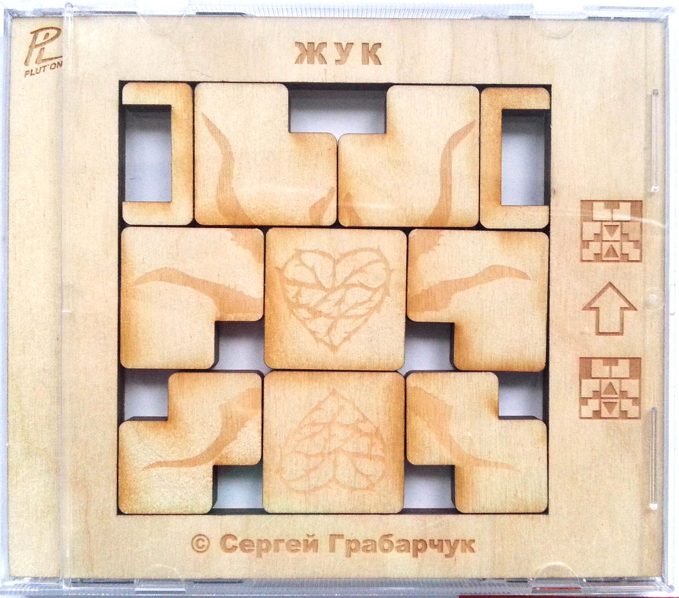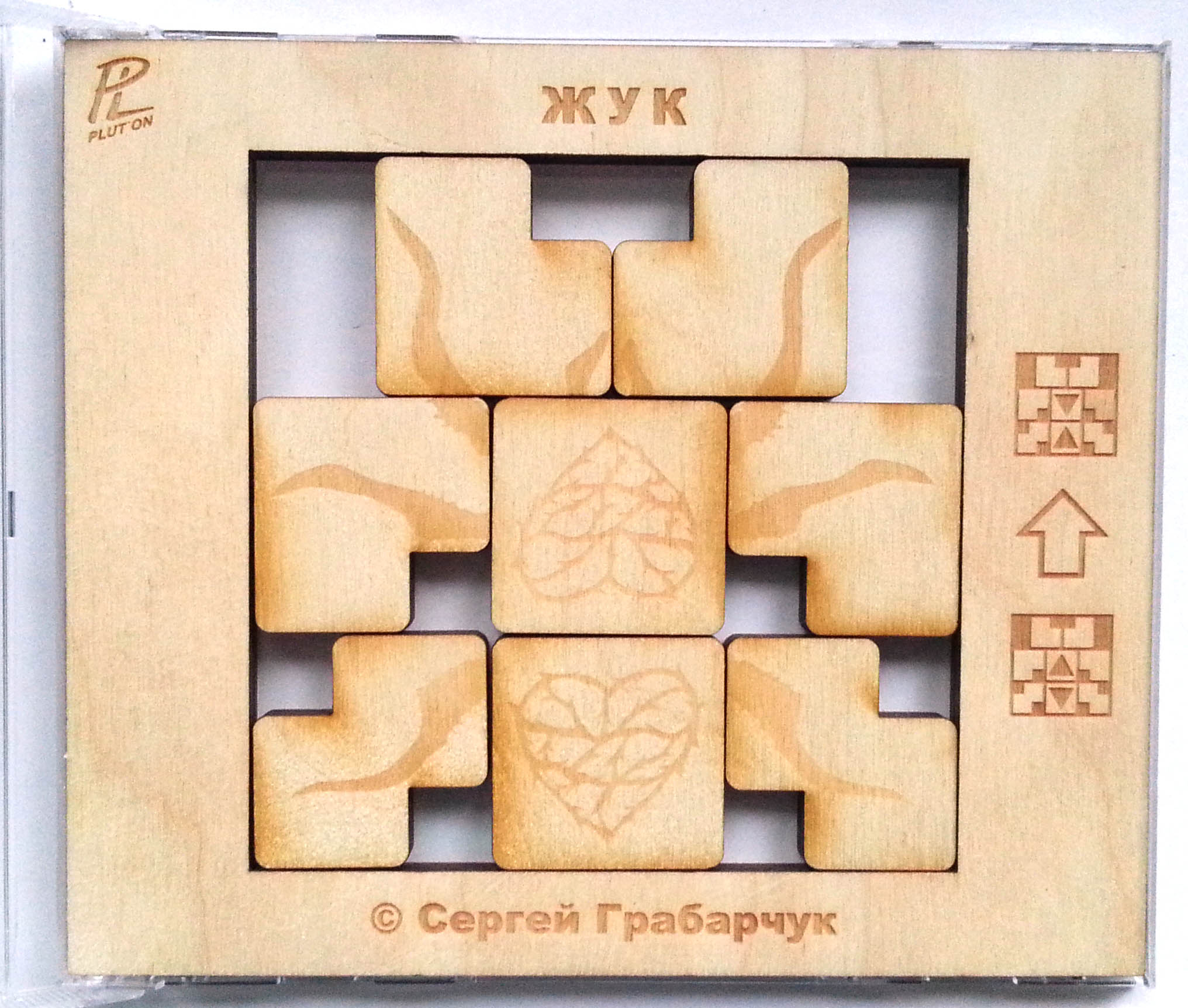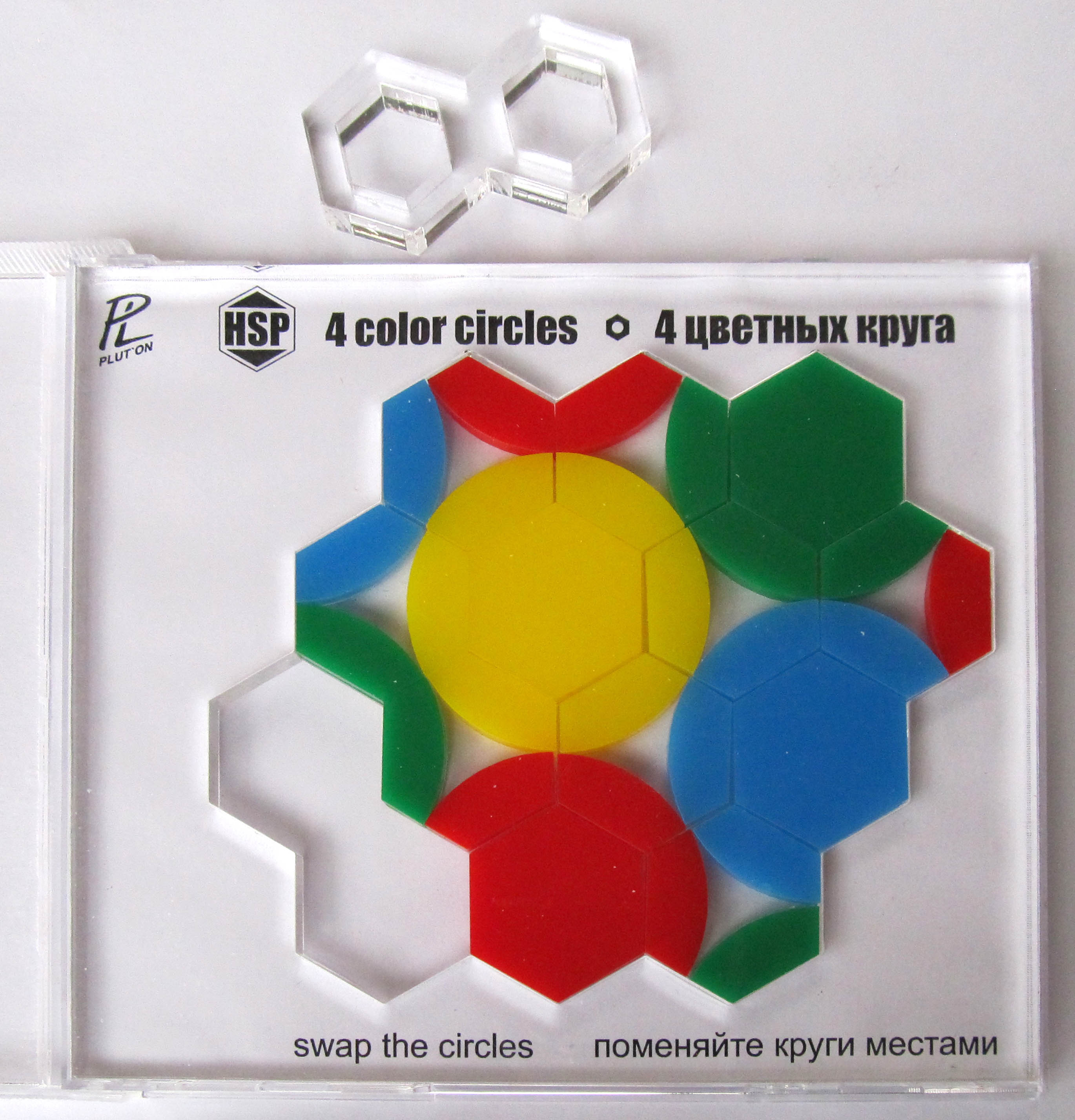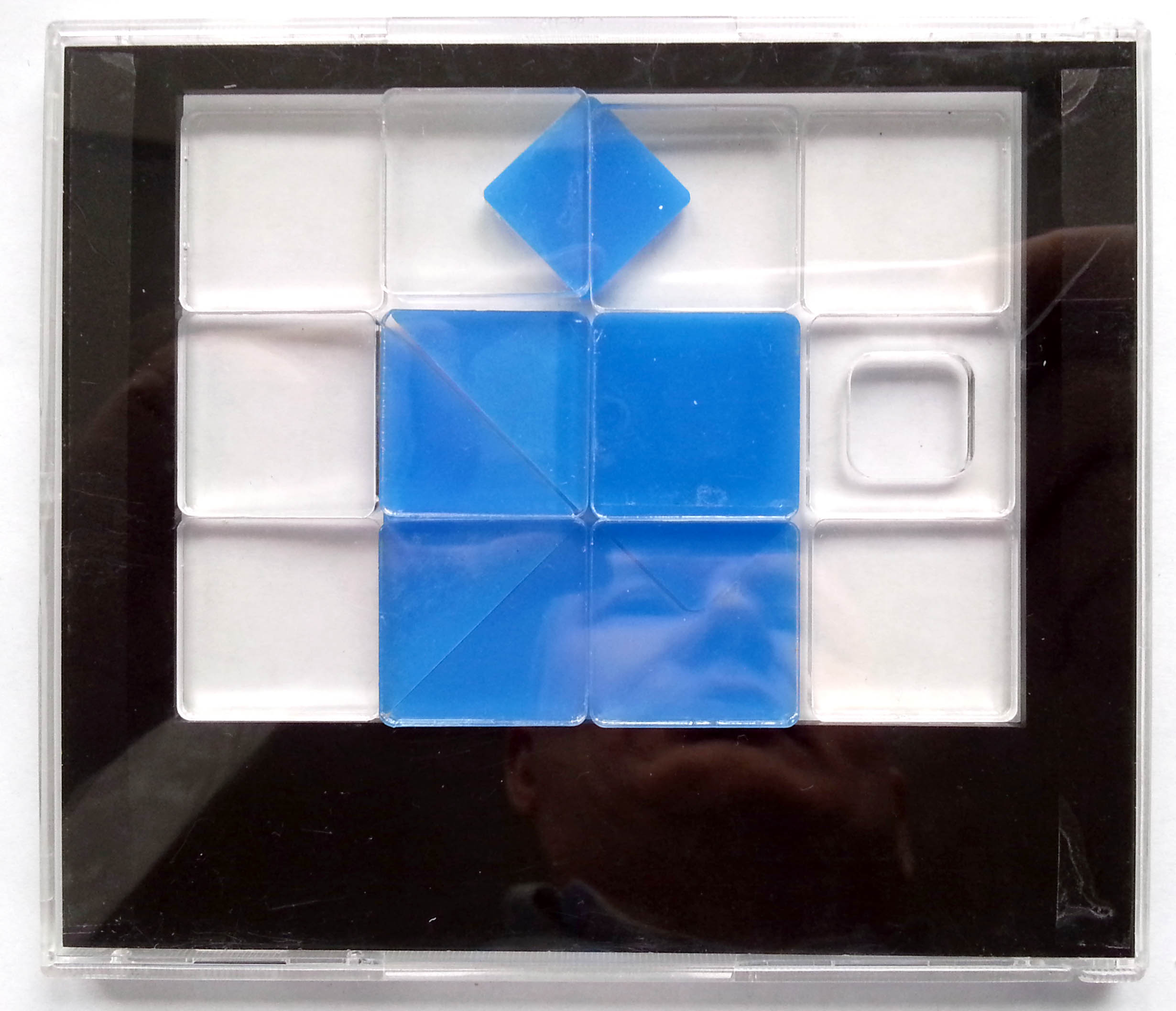 Головоломка сделана в уже проверенном формфакторе под коробку CD. Рамка с гравировкой - двухслойный пластик, фишки - прозрачное и цветное оргстекло.