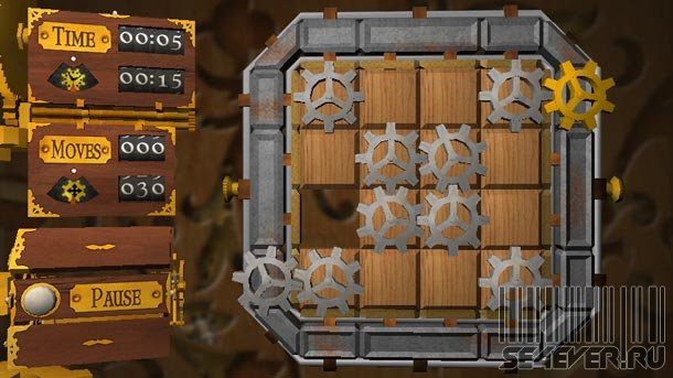 Пока я не занимался подробным анализом этой головоломки. Понял только, что можно усложнять, либо упрощать задачу, меняя в начальной раскладке фишки с шестерёнками на пустые и обратно.